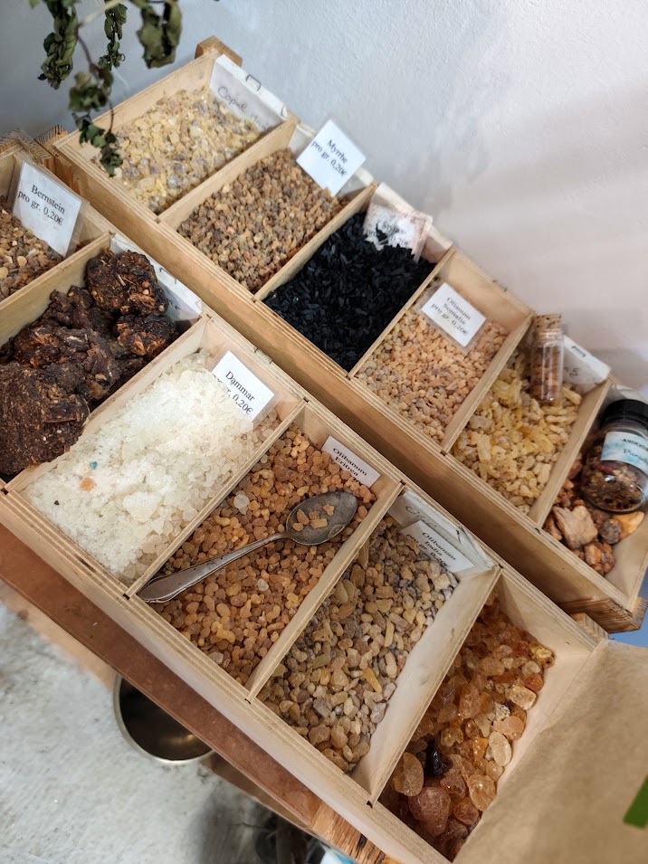 Styrax – Der echte kleine strauchige Styraxbaum stammt aus Syrien und Griechenland. Styrax – Pulver ist mit Styraxbalsam getränkte Holzkohle. Es duftet süßlich, mit einem Hauch Exotik und Sinnlichkeit. Styrax ist hervorragend geeignet, um romantische, sensible und liebevolle Stimmungen zu erzeugen und zu begleiten. Es löst Sorgen und negative Gedanken auf und ermöglicht es dem Benutzer daher, sich ganz auf solche Stimmungen einzulassen.